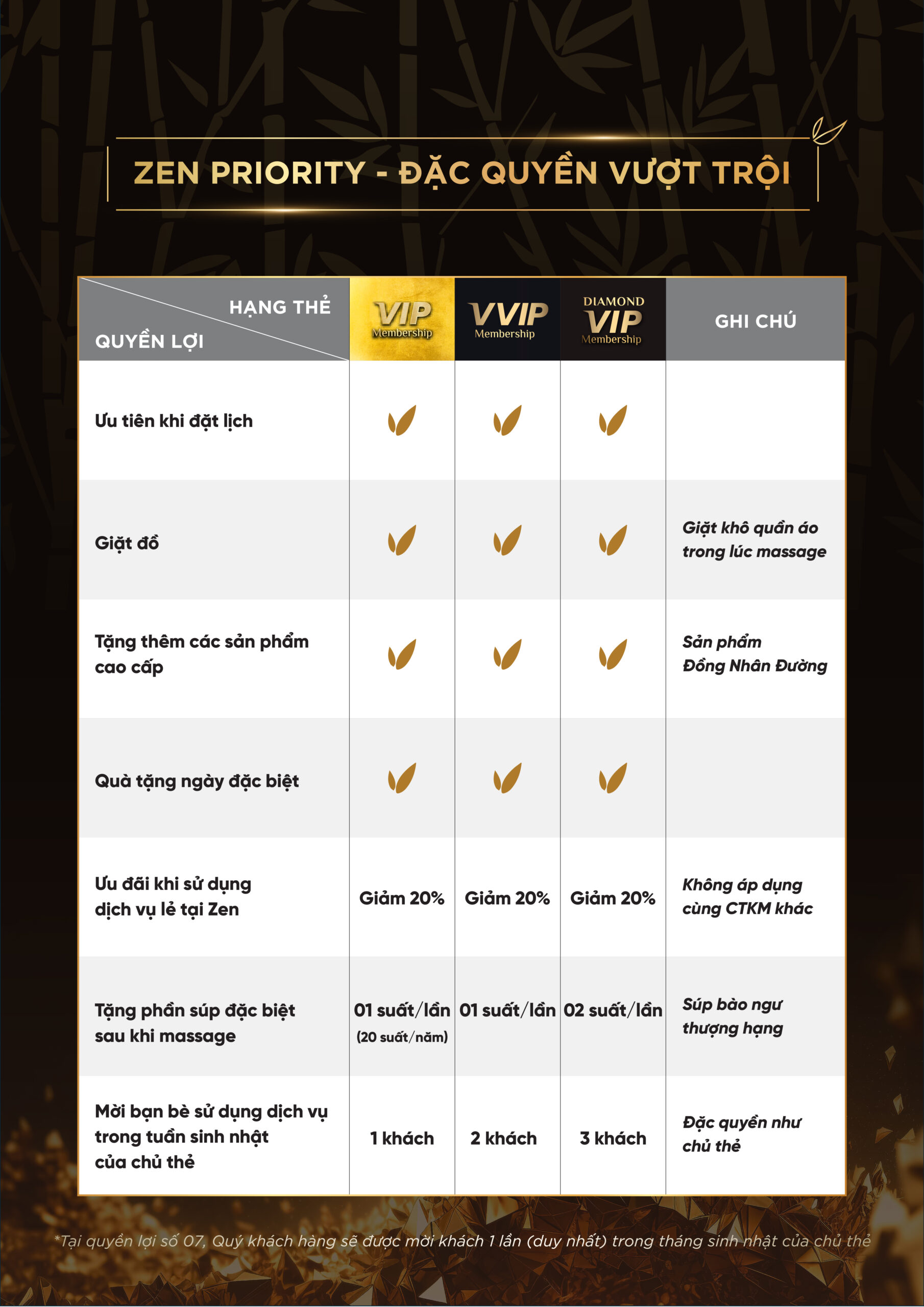 Lưu ý: Quyền lợi số 10, Quý khách hàng sẽ được mời khách 1 lần (duy nhất) trong tháng sinh nhật của chủ thẻ.